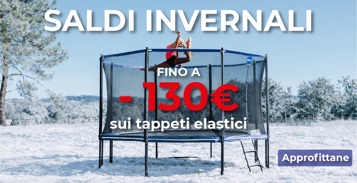 I nostri tappeti elastici sono ancora più sicuri grazie alla doppia chiusura della rete: entrata con zip + moschettoni all'esterno. La rete tessile è realizzata in un tessuto anti-UV molto resistente con maglie strette che evitano che i bambini vi intrappolino le dita.