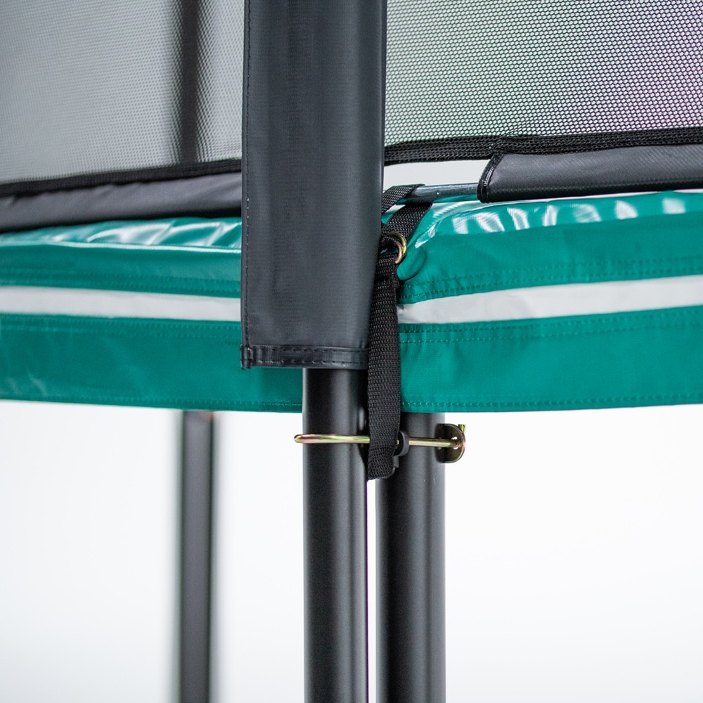 - Per voi solo protezione e sicurezza! I montanti superiori sono rivestiti da gommapiuma protettiva di 10 mm di spessore e da un rivestimento in PVC, assicurando che i colpi vengano attutiti in caso di contatto con il palo. Con un’altezza di 2,69 m, la rete proteggerà senza problemi tutti gli utenti, anche coloro che vogliono provare salti esagerati! La tensione è garantita dagli archi in fibra di vetro, posti nella parte superiore. La rete viene fissata al di sotto del tappeto elastico, così da non lasciare nessuno spazio libero e pericoloso fra rete e cuscino.