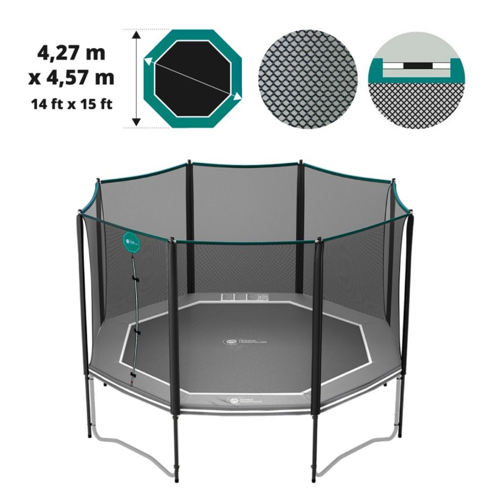 Mai trascurare la sicurezza del vostro tappeto elastico e il buono stato delle componenti che la garantiscono! Se vi rendete conto che la rete tessile del vostro trampolino elastico si è rovinata con il tempo e l'utilizzo, pensate a sostituirla. Se la struttura portante è ancora in buono stato, Salt'in Italy vi propone un pezzo di ricambio che vi permetterà di cambiare la sola rete tessile. Questa pezzo di ricambio è perfettamente compatibile con i trampolini elastici ottagonali 430 di  Salt'in Italy ma anche con i tappeti elastici di altre marche che possiedono le stesse caratteristiche tecniche.