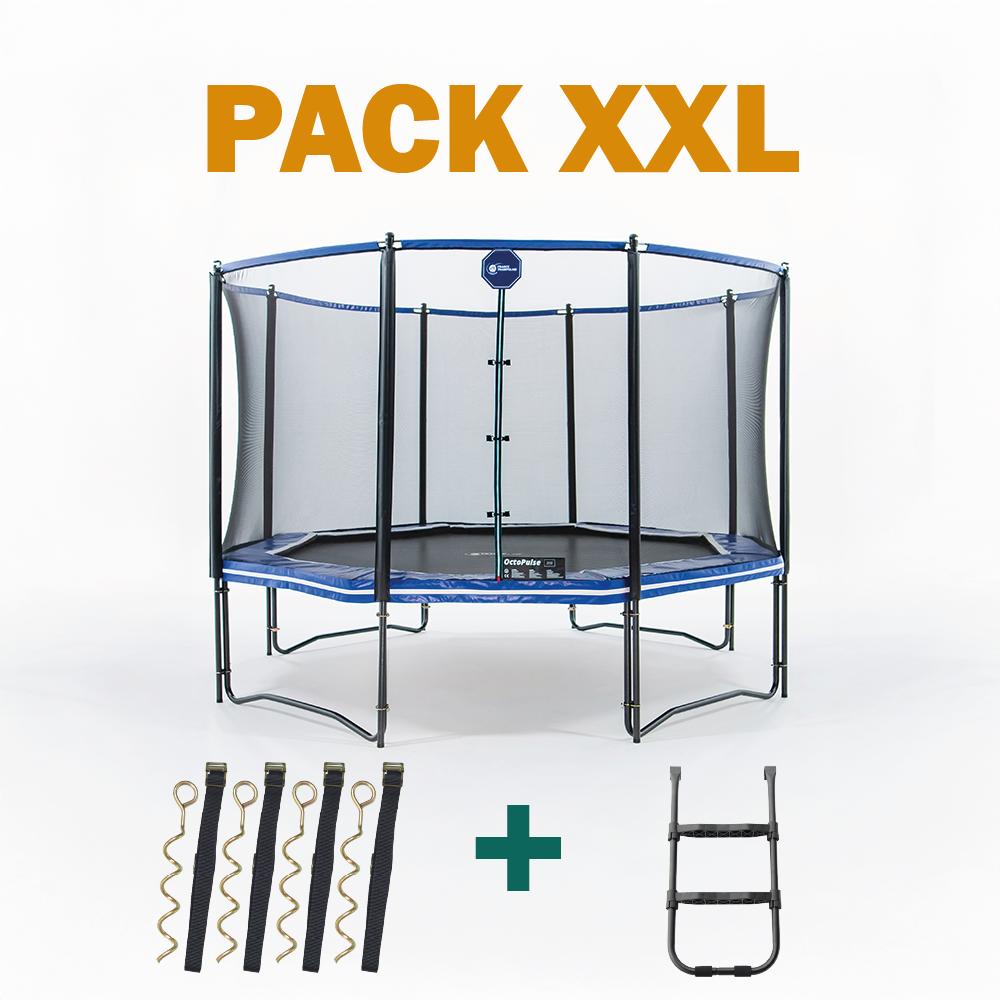 Pack XXL Tappeto elastico Octopulse 390 con rete di protezione, scaletta, copertura e kit di fissaggio. Ideale per salti elaborati.
