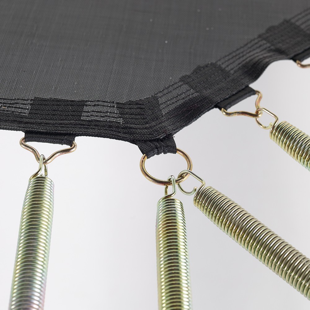 Per garantire questa sicurezza, ogni palo è saldamente fissato alle gambe del trampolino con robuste staffe vicino al terreno e alle molle. Questo sistema, testato e approvato da oltre 15 anni, supera di gran lunga i fissaggi tradizionali con viti ravvicinate o pali pieghevoli.