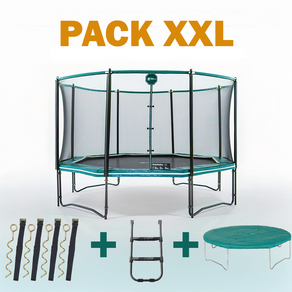 Pack XXL Tappeto elastico Octopulse 390 con rete di protezione, scaletta, copertura e kit di fissaggio. Ideale per salti elaborati.