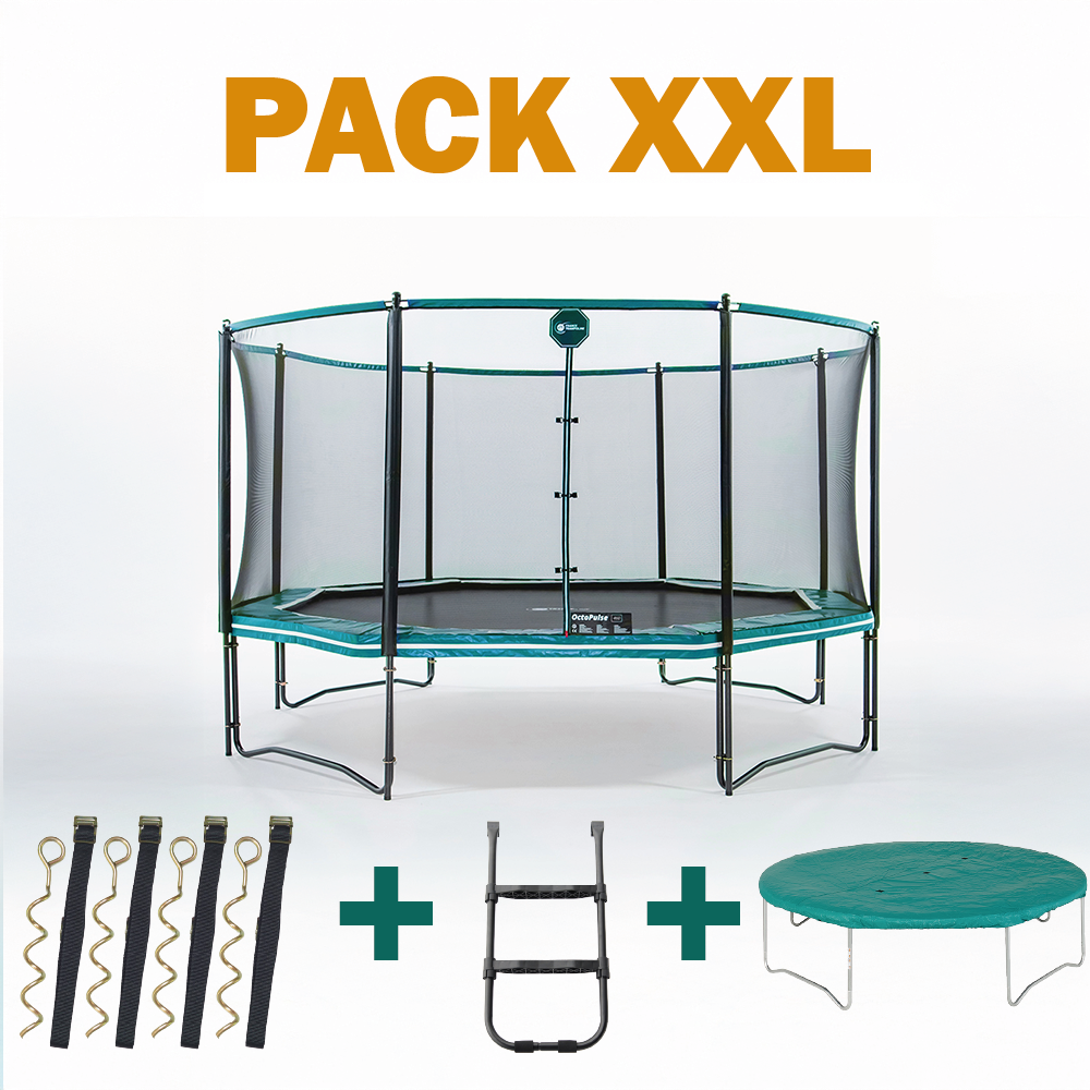 Pack XXL Tappeto elastico ottagonale Octopulse 460 con rete di protezione, scaletta, copertura e kit di fissaggio. Un tappeto ottagonale per un sacco di salti.