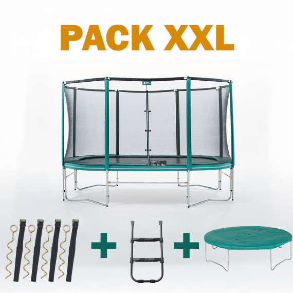Pack Tappeto elastico Ovalie 430 con rete di protezione, scaletta, copertura premium e kit di fissaggio. Perfetto per le famiglie.
