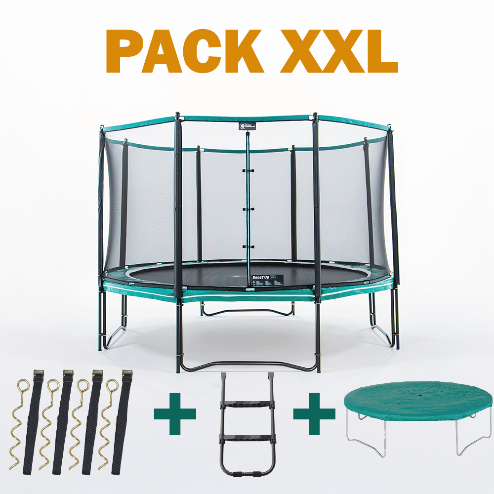Un Pack completo per mantenere il tappeto elastico Boost'Up 390 come nuovo per anni! Questo pacchetto è composto dal tappeto elastico Boost'Up 390 con rete, scaletta, kit di fissaggio e copertura premium.