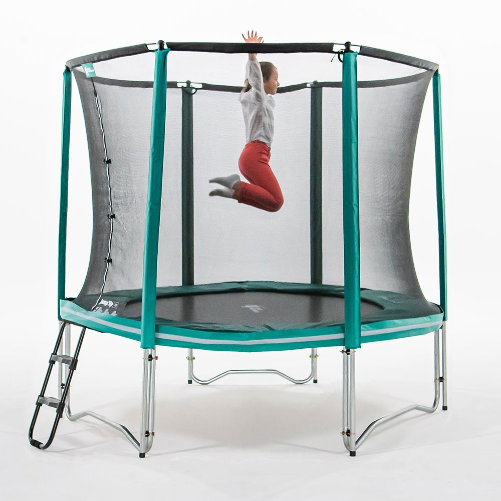 Questo Pack Jump'Up 250 con rete di protezione, scaletta, kit di fissaggio e telo di protezione ha tutto il necessario per permettere a tutta la famiglia d'iniziare ad allenarsi sul tappeto in tutta sicurezza.