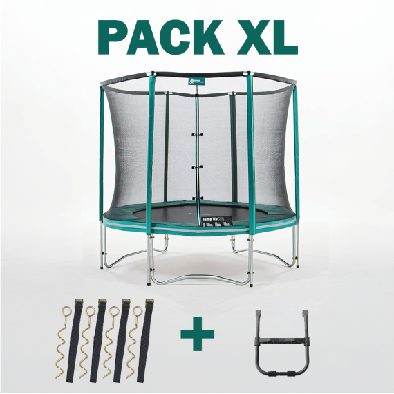 Questo Jump'Up 250 - Pack XL con rete di protezione, scaletta e kit di fissaggio ha tutto il necessario per iniziare ad allenarsi sul tappeto in totale sicurezza.